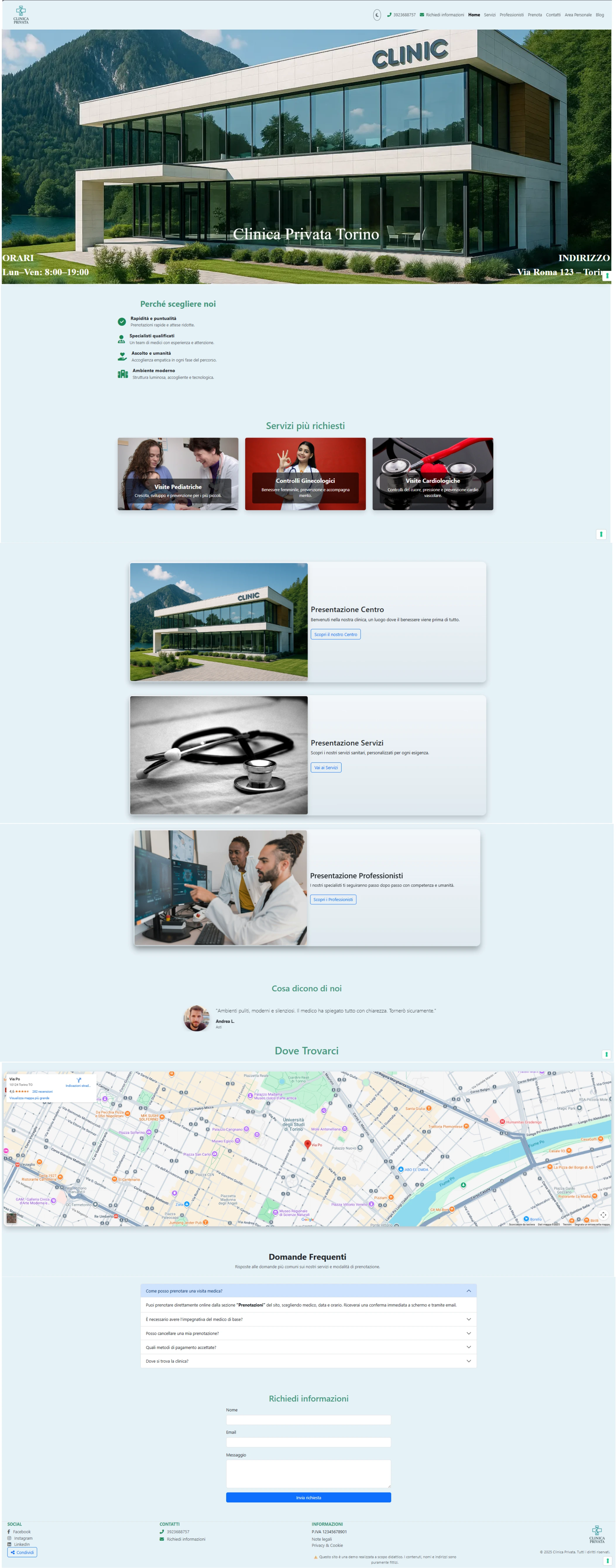Il progetto nasce come incarico reale per la realizzazione del sito di una clinica privata, con l’esigenza di costruire una presenza digitale moderna, chiara e affidabile. L’obiettivo era creare un’interfaccia semplice da navigare, con contenuti organizzati in modo intuitivo così da permettere ai pazienti di orientarsi rapidamente tra servizi, medici e contatti.